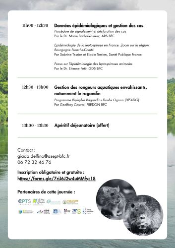 Des données épidémiologiques nationales et régionales seront présentées, avec un focus sur la Bourgogne-Franche-Comté, ainsi que les procédures de signalement et de gestion des cas. Un temps sera également consacré à la gestion des rongeurs aquatiques envahissants, notamment le ragondin, à travers la présentation du programme PRADO.